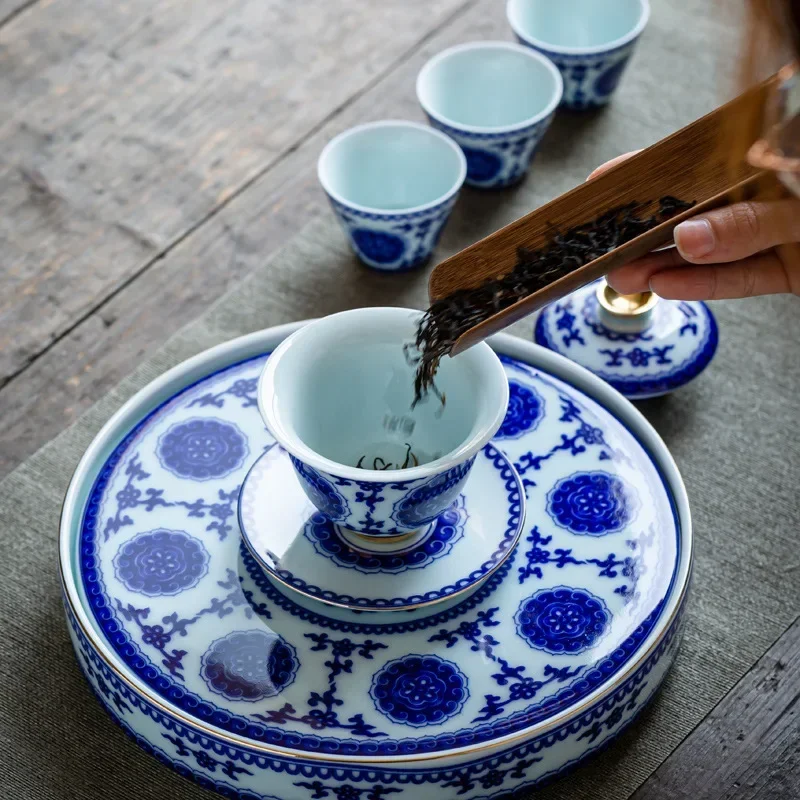Chinese Kung fu Tea Set, Jingdezhen Ceramic Gaiwan, Blue and White Sancai Tea Bowls, Cups with Tray, Household Teacup and Saucer