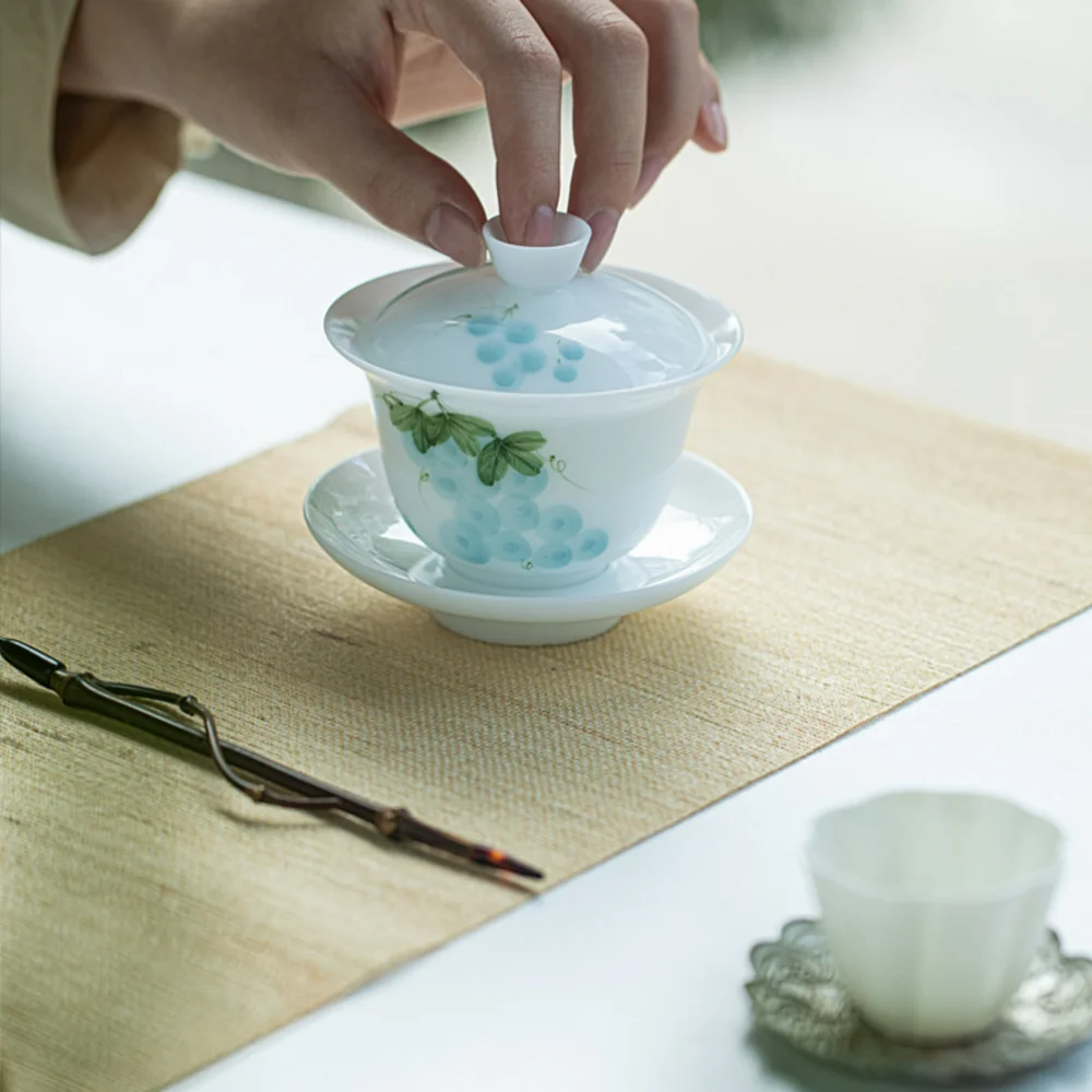 Hand- Ceramic Sancai Kung Fu Tea Set Jade Clay White Porcelain Painted Household Heaven and Earth Gaiwan