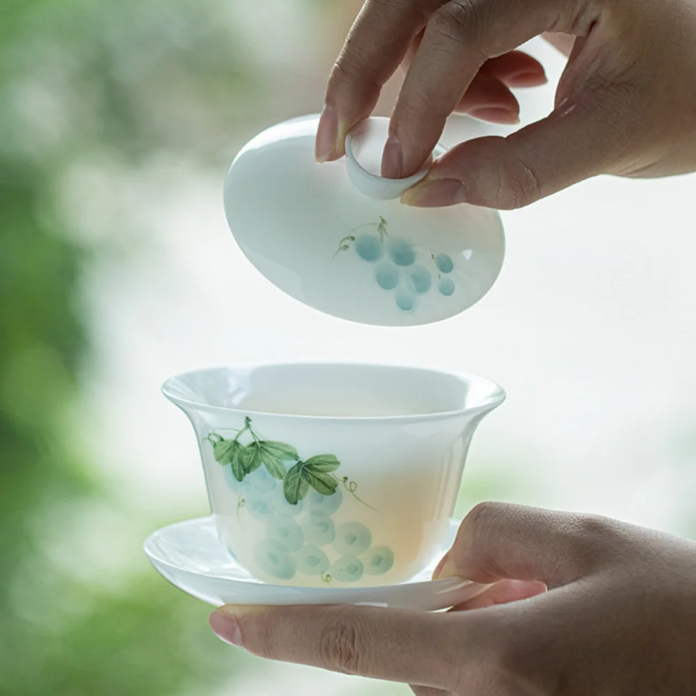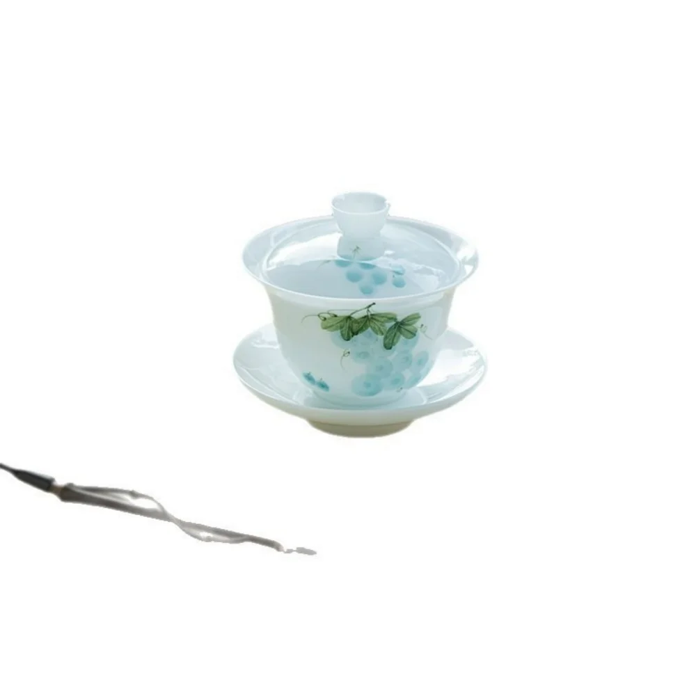 Hand- Ceramic Sancai Kung Fu Tea Set Jade Clay White Porcelain Painted Household Heaven and Earth Gaiwan