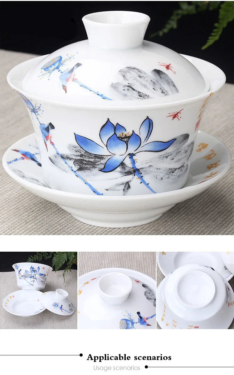 Chinese Hand Painted Kungfu Tea Set, Tureen Dehua, White Porcelain, Gaiwan, Pot Set for Travel, Fast Cup, High Quality