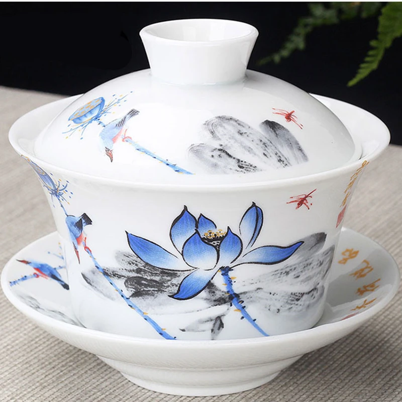 130ML Sheep Fat Jade Porcelain Gaiwan Enamel Colored Blue And White Dragon Palace Tea Tureen Tea Brewing Cover Bowl Tableware