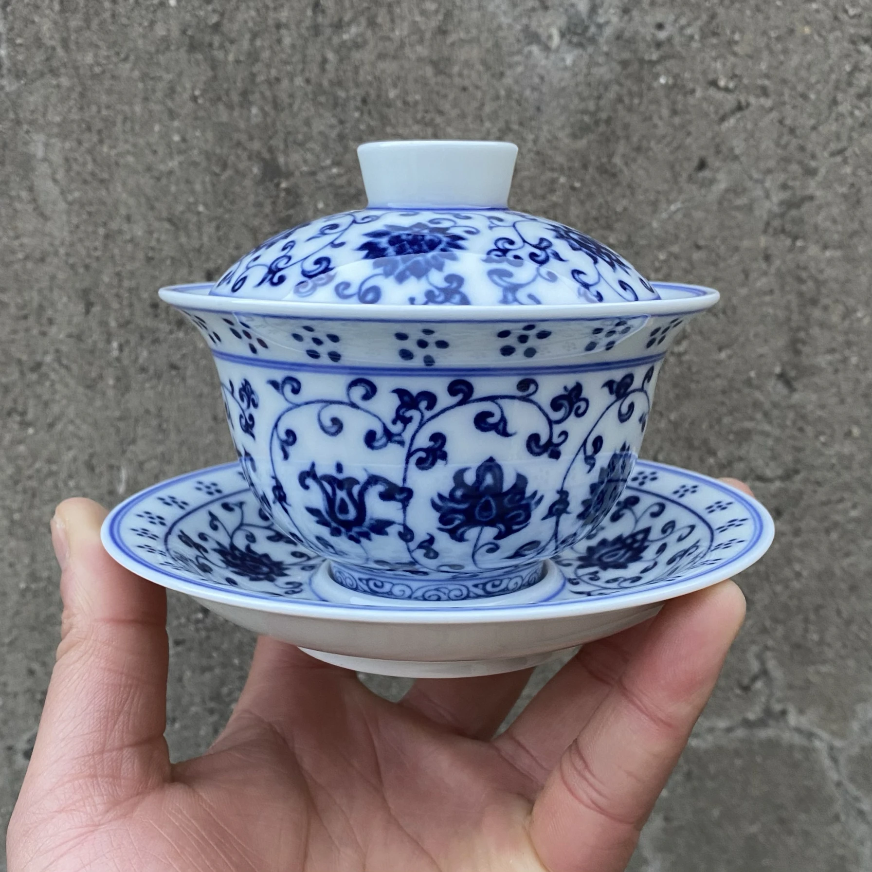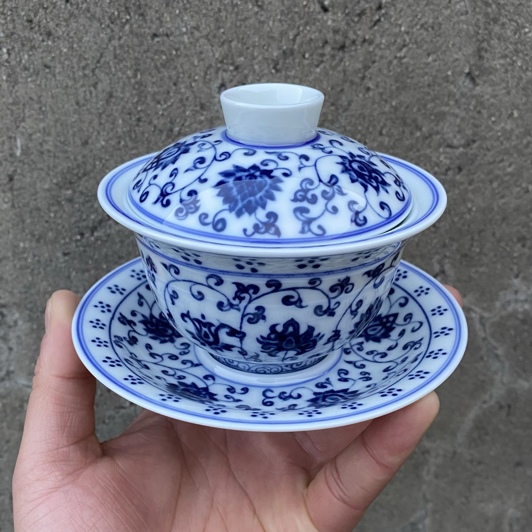 Blue and White Porcelain Gaiwan Tea Cup Large White Porcelain Ningxia Eight Treasures Tea Bowl Set Three Talents Tea Bowl Tea