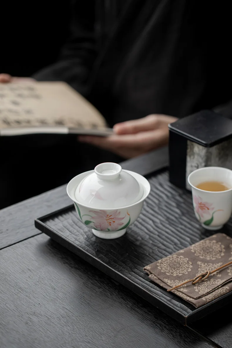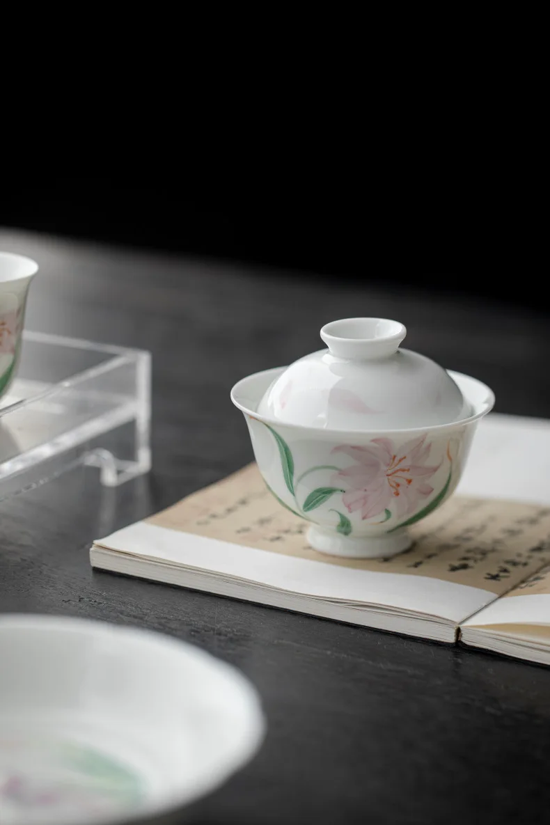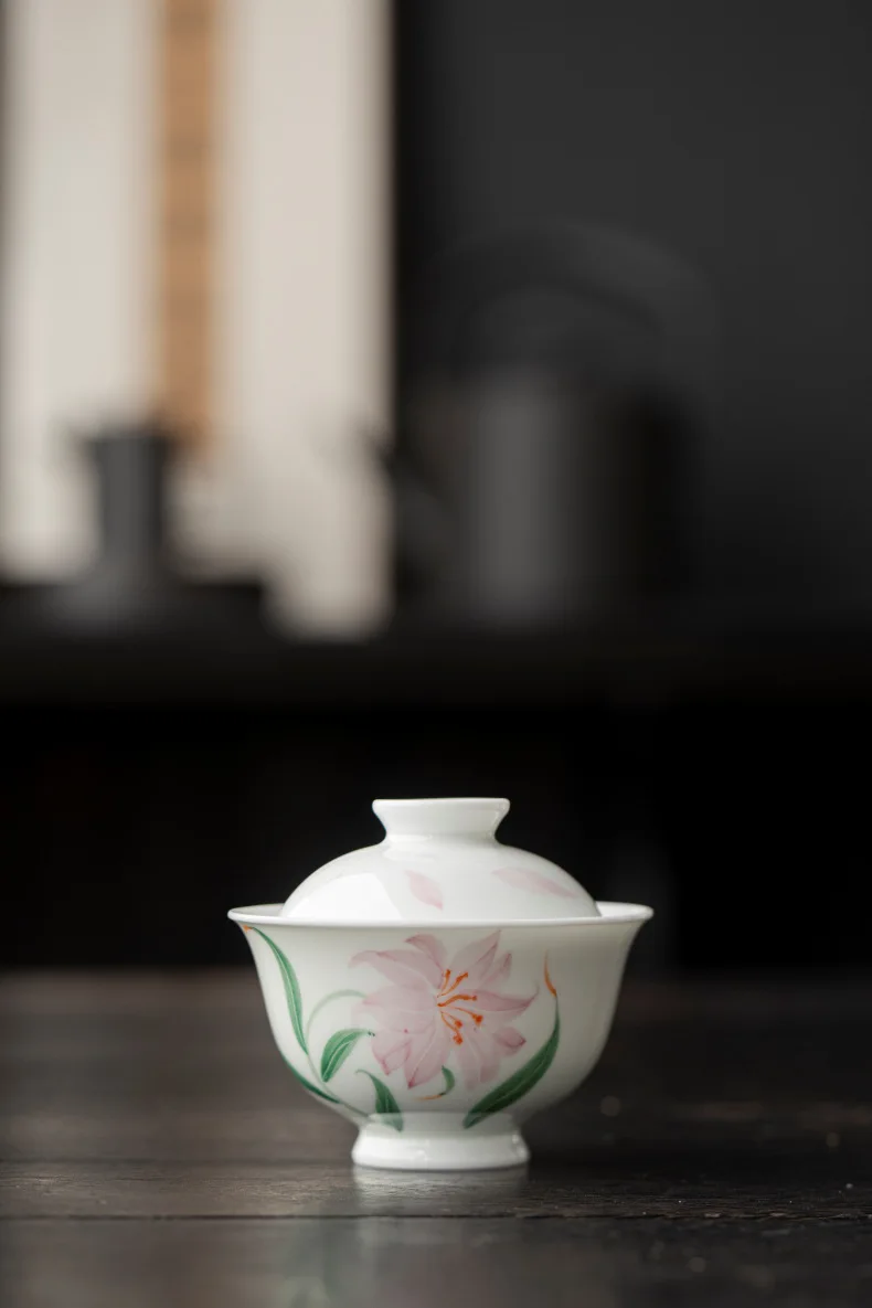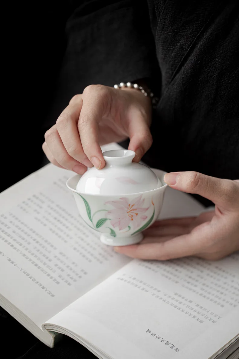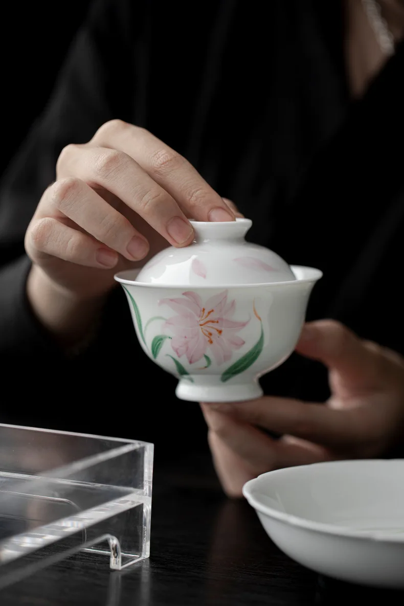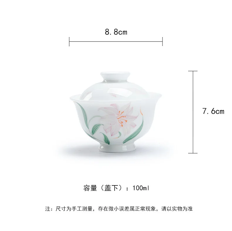Jade Mud White Porcelain Hand-painted Lily Covered Bowl Underglaze Colored Ceramic Tea Cup Single Kung Fu Tea Set Small and