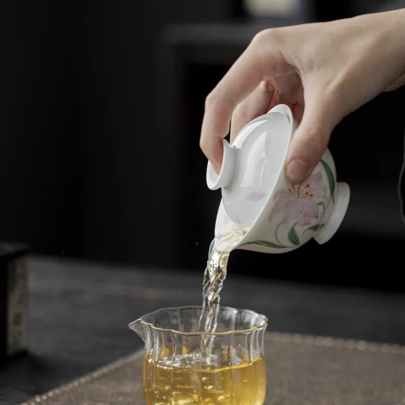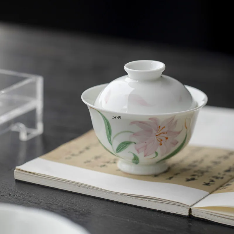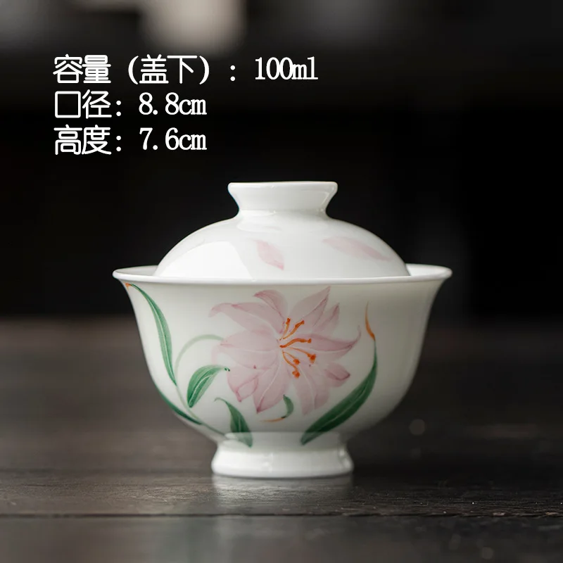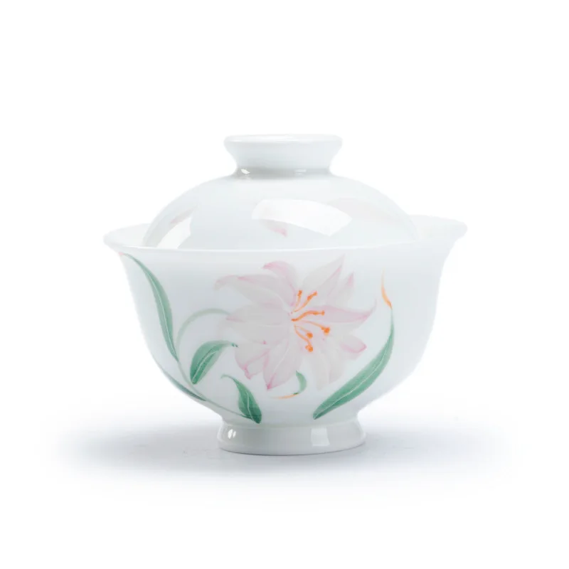 Jade Mud White Porcelain Hand-painted Lily Covered Bowl Underglaze Colored Ceramic Tea Cup Single Kung Fu Tea Set Small and