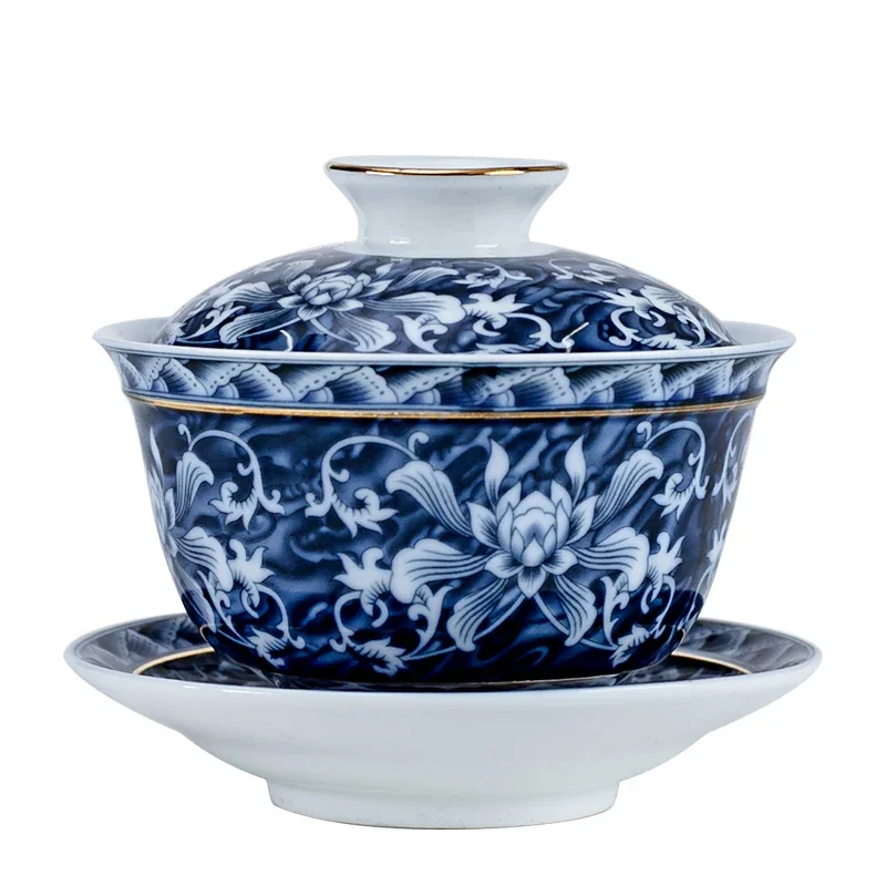Blue and White Porcelain Suspended Lid Bowl Three Talents Bowl Tea Brewing Device Tea Offering Bowl High Aesthetic Company Event