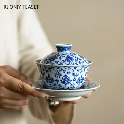 Handmade Jingdezhen Ceramic Seven Chopsticks Hall Blue and White Painting Interlock Branch Gaiwan Non-Scald Tea Brewing Bowl Set
