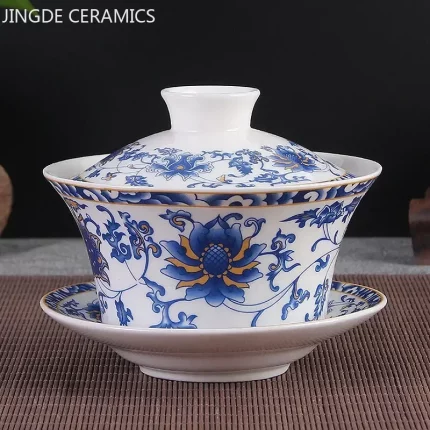 Jingdezhen Ceramic Gaiwan High Quality Sancai Tea Bowl Chinese Traditional Pattern Cover Bowl Blue and White Porcelain Tea Set