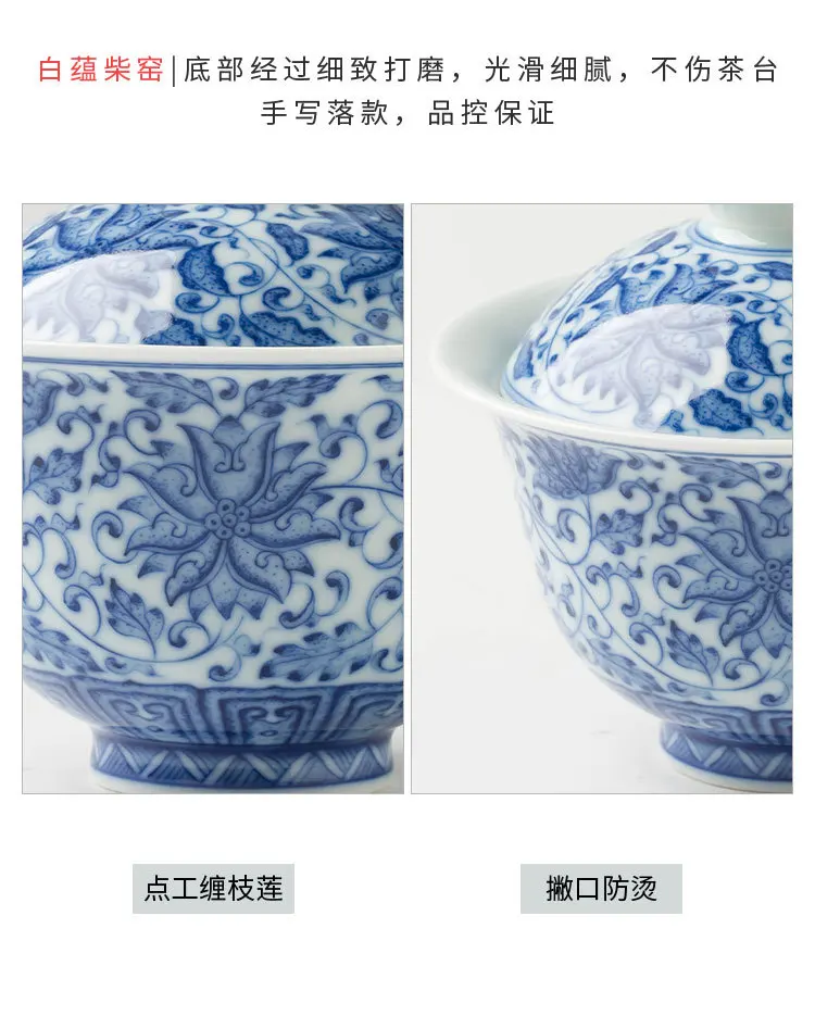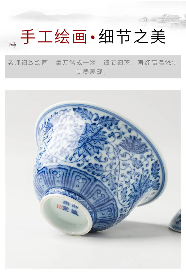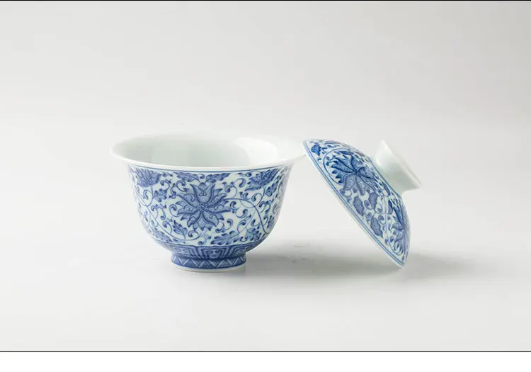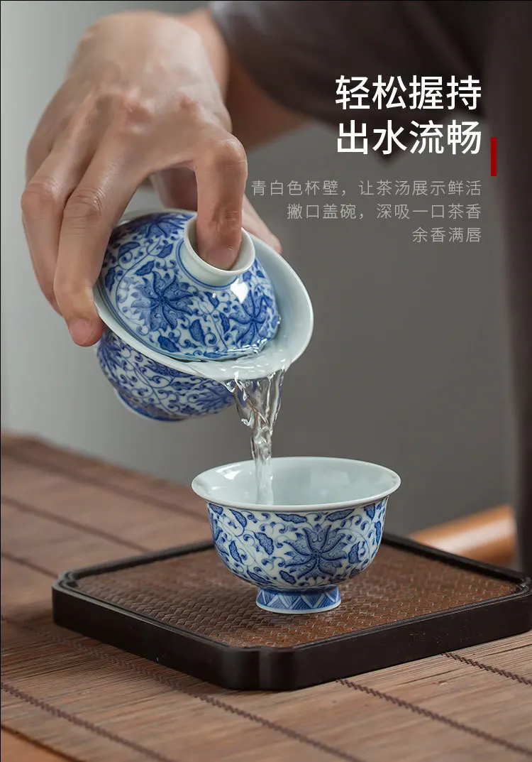 Handmade Jingdezhen Ceramic Seven Chopsticks Hall Blue and White Painting Interlock Branch Gaiwan Non-Scald Tea Brewing Bowl Set