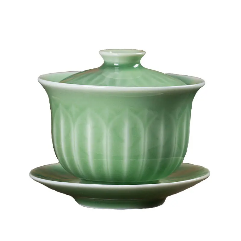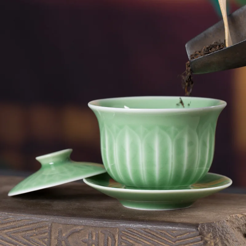 180ML celadon cover bowl, Chinese style pure hand-carved Kung Fu tea set, tea bowl, hand-held tea bowl