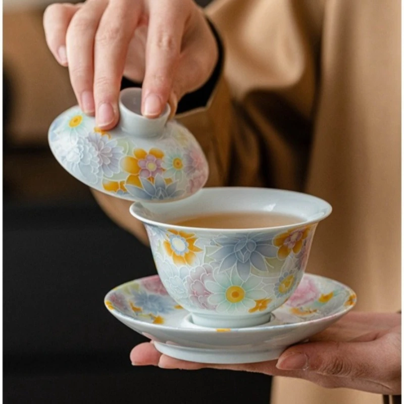 Chinese Ceramic Gaiwan Hand Painted Teacup Tea tureen handmade Porcelain Teaware Accessories Drinkware Personal Single Cup