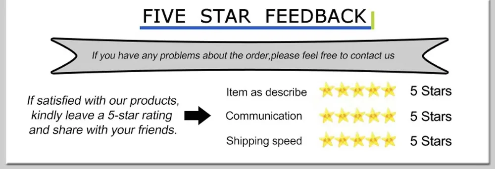 Your confirmation will be highly appreciated after receiving the items. Once you have received the product, hope you could leave us a positive feedback(4 or 5 stars). -BEFORE you leaving the negative feedback. PLEASE contact us at first, and we can help you solve the problem.