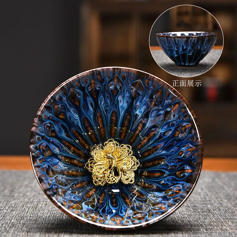 Jianzhan-Tenmoku Tea Cup with Golden Peacock, 3D Chinese Kungfu Tea Cup, Porcelain Master Teacup