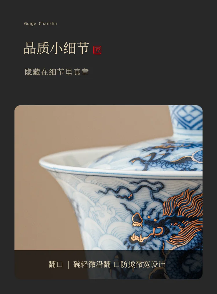 Metal Inlay Blue and White Chinese Dragon Gaiwan Single Ceramic Kungfu Tea Set Tea Making Bowl Tea Tureen