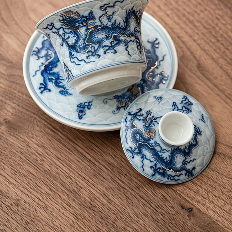 Metal Inlay Blue and White Chinese Dragon Gaiwan Single Ceramic Kungfu Tea Set Tea Making Bowl Tea Tureen