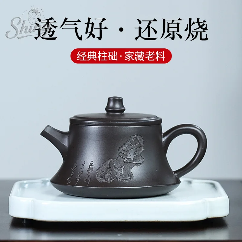 Original Vermilion Clay Reduction Burnt Purple Sand Pot Handmade Engraved Far View Column Base Teapot Home Kung Fu Tea Set