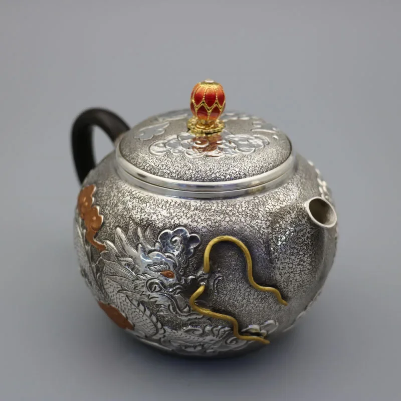 Sterling silver handmade small teapot, dragon and phoenix Chinese style, boutique tea set silver pot