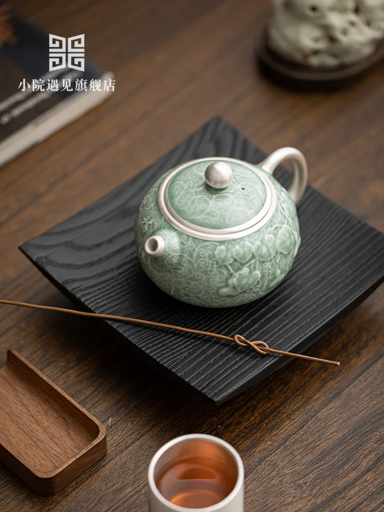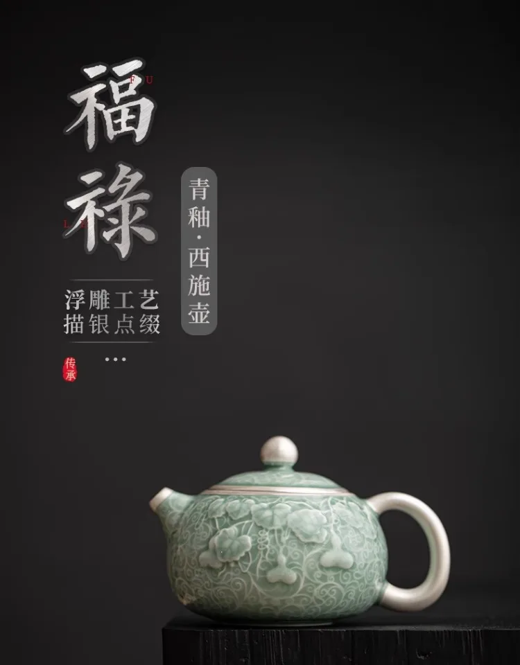 Teapot Ceramic High-end Relief Hand-painted Silver Box Large Capacity Multi-functional with Handle Household Gourd Green Glaze