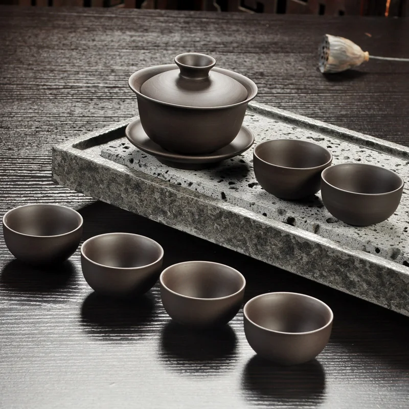 Yixing Purple Sand Tea Set Black/Red Ceramic Kung Fu Teapot Handmade Teacup Gaiwan Tureen Tea Ceremony (Not Include Stone Table)