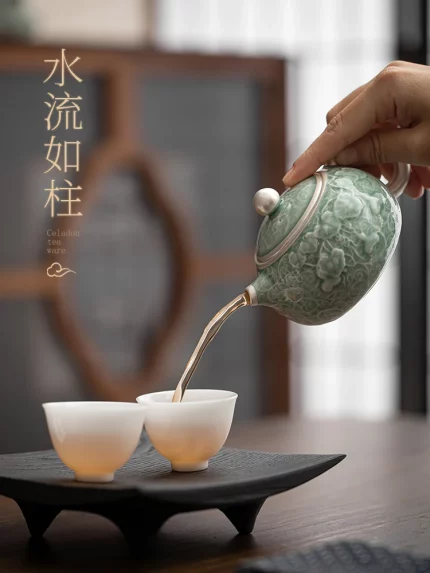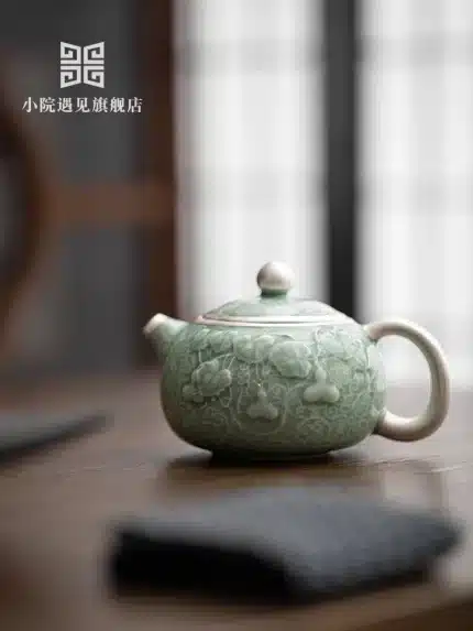 Teapot Ceramic High-end Relief Hand-painted Silver Box Large Capacity Multi-functional with Handle Household Gourd Green Glaze