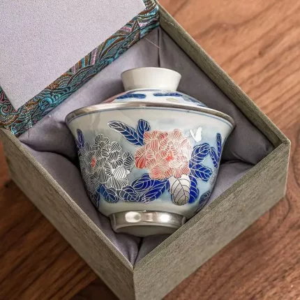 130ML Hand-painted 999 Silver Peony Ercai Cover Bowl Household Teacup with Cover KungFu TeaSet Chinese TeaBowl High-end Gift Box