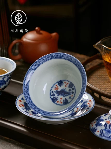 Handmade Jingdezhen High-Grade Alum Red Pattern Cover Teacup Single Household Ceramic Tea Maker Kung Fu Set Bowl with Lid
